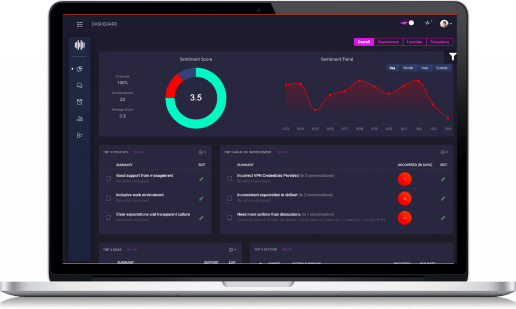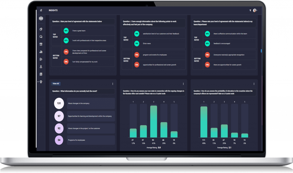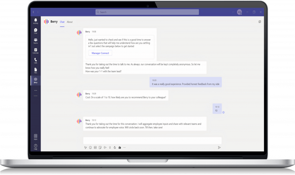 Collects feedback and gauges workplace sentiment through automated, periodic questionnaires and interactions. This ensures a constant stream of communication between employees and management, and generating real-time actionable insights